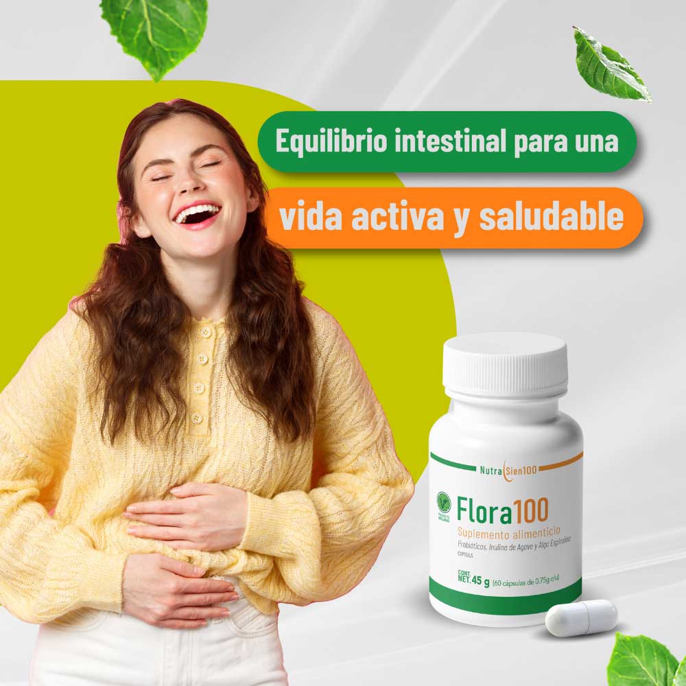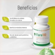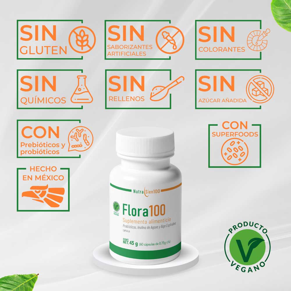 Producto vegano con la combinación de probióticos y prebióticos para beneficiar la microbiota intestinal y aumentar el sistema inmune digestivo.