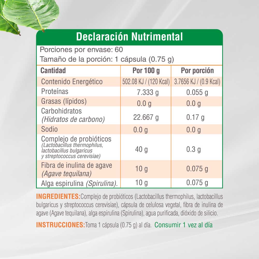 Conjunto de prebióticos (Inulina de agave y alga espirulina). Beneficia digestión y estreñimiento.